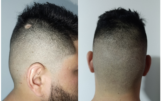 Paciente masculino de 32 años, natural de Cali, Colombia, con cuadro clínico de 12 meses de evolución caracterizado por la aparición progresiva de lesiones nodulares en el cuero cabelludo, inicialmente eritematosas y dolorosas a la palpación. Posteriormente, las lesiones desarrollaron un opérculo con drenaje serosanguinolento, seguido de la formación de áreas alopécicas residuales.