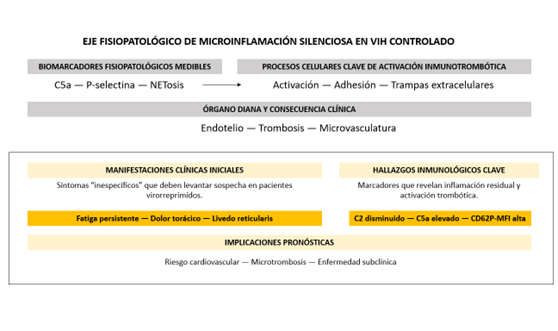La persistencia de inflamación inmunometabólica en personas que viven con VIH virorreprimido constituye un desafío clínico emergente, asociado a mayor carga de comorbilidades no definitorias de SIDA y riesgo cardiovascular precoz. El objetivo de esta revisión y reporte de caso es analizar el papel fisiopatológico del eje complemento–plaquetas–NETosis (C2–C5a/C5aR–CD62P–NETs) en la activación inmunotrombótica subclínica y su relevancia diagnóstica y terapéutica. Se realizó una búsqueda narrativa estructurada no sistemática en PubMed, Scopus y Web of Science, incluyendo estudios experimentales, observacionales y ensayos clínicos publicados entre 2017–2025 sobre inflamación residual, inmunotrombosis y biomarcadores del complemento en VIH controlado. Los principales hallazgos indican que, incluso bajo supresión virológica sostenida, persiste disregulación del complemento con disminución de C2 y aumento de C5a, acompañada de activación plaquetaria (CD62P-MFI) e inducción de NETosis, mecanismos que favorecen microtrombosis endotelial y enfermedad cardiovascular silenciosa.