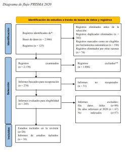 El proceso de búsqueda sistemática identificó inicialmente 2,846 registros a través de las bases de datos consultadas, más 125 registros adicionales. Después de eliminar 542 duplicados, quedaron 2,170 artículos para el cribado inicial. Tras aplicar los criterios de inclusión y exclusión en las fases de cribado por título y resumen, se identificaron 274 informes para recuperación de texto completo, aunque 31 de estos no pudieron ser recuperados. De los 243 informes evaluados en texto completo, se excluyeron 227 por diversas razones metodológicas y de elegibilidad, resultando en la inclusión final de 20 estudios en la revisión sistemática y 16 informes de estudios en el metaanálisis cuantitativo, con un total de 9,269 participantes (2,17).