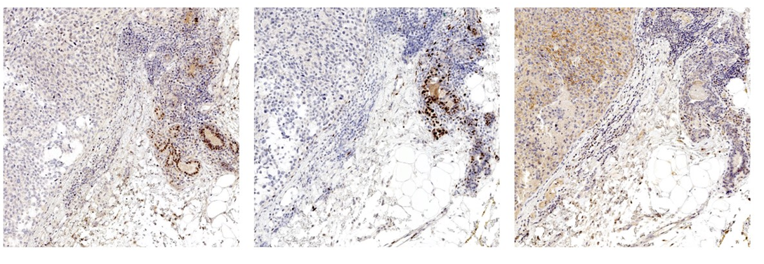 IMAGEN NO.1: En la biopsia con aguja gruesa de mama izquierda se observó una proliferación de células fusiformes atípicas con patrón sarcomatoide, asociada a áreas focales de diferenciación epitelial escamosa. Los estudios inmunohistoquímicos mostraron positividad difusa para citoqueratina 7 y p63, confirmando el origen epitelial de la lesión, mientras que la proteína S100 fue negativa. La expresión de receptores hormonales fue evaluada mediante tinciones para estrógeno y progesterona, ambas negativas en el componente tumoral, con tinción limitada a estructuras benignas residuales. De igual forma, la tinción para HER2 evidenció ausencia de marcaje membranoso completo, descartando sobreexpresión de este marcador. Las microfotografías a 10x de magnificación documentan la negatividad para ER, PR y HER2. En conjunto, los hallazgos morfológicos e inmunohistoquímicos permiten establecer el diagnóstico de carcinoma metaplásico de mama, subtipo fusocelular (sarcomatoide), con fenotipo triple negativo (ER–/PR–/HER2–), una entidad poco frecuente y de comportamiento clínico agresivo. Fuente: Contribución por Joshua J.X.Li,M.B.Ch.B. and Gary M. TSE, M.B.B.S – Pathologyoutline.com – Breast (26).
