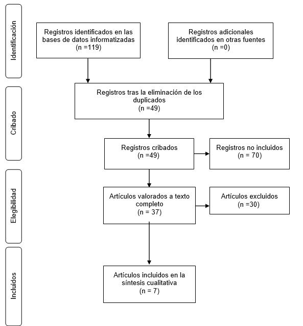 Del total de bases de datos consultadas, se obtuvo un total de 119 estudios. Tras la eliminación de los duplicados con el programa Rayyan QCRI (13), se procedió a la lectura del título y del resumen de 49, donde, un total de 37 ensayos cumplieron los criterios de inclusión. Tras realizar una lectura del texto completo de dichos estudios, se excluyeron 30 debido a que no cumplieron los criterios específicos de selección. Finalmente, un total de 7 ensayos formaron parte de esta revisión sistemática (véase figura 1: diagrama de flujo).