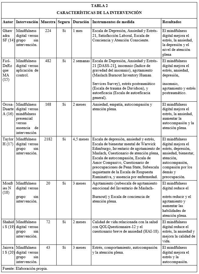 Respecto a las intervenciones realizadas en todos los ensayos clínicos se llevó a cabo el mindfulness digital en el grupo experimental. En el grupo control no se llevó a cabo ninguna intervención adicional en los ensayos de Ghawadra SF et al. (2020), Taylor H et al. (2022), Monfries N et al. (2023), Shahidi S et al. (2023) y Jaiswal S et al. (2024). En el estudio de Fiol-DeRoque MA et al. (2021) se utilizó una aplicación móvil de control, y en el de Orosa-Duarte Á et al. (2021) se comparó mindfulness digital con mindfulness presencial con ausencia de intervención