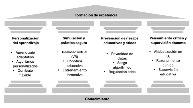 La integración responsable de la IA en la educación sanitaria podría sustentarse en cuatro pilares complementarios (Figura 1):