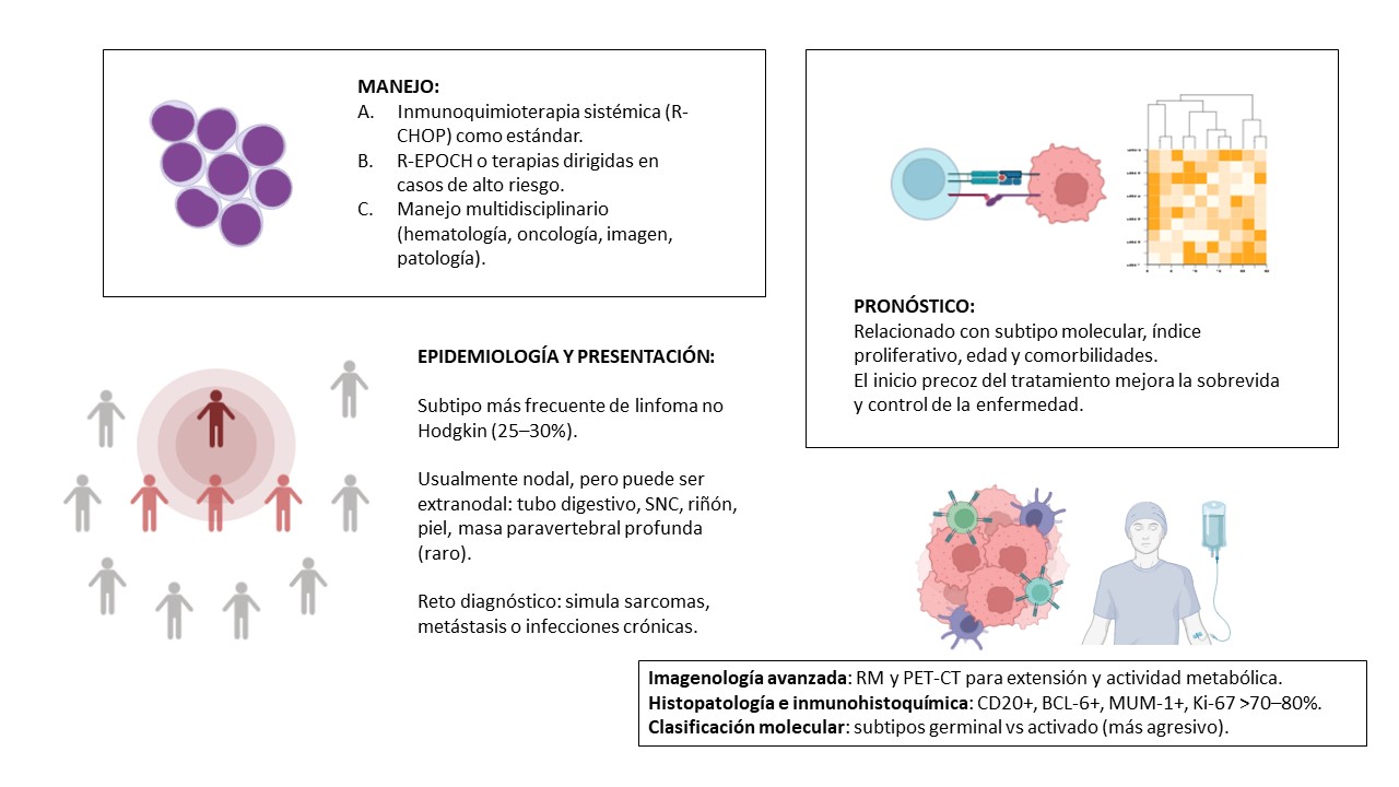 A pesar de su comportamiento biológico agresivo, la disponibilidad de esquemas inmunoquimioterápicos como Rituximab, Ciclofosfamida, Hidroxidaunorrubicina, Oncovin y Prednisona (R-CHOP) ha transformado su pronóstico, ofreciendo tasas de remisión completa y curación en una fracción importante de los casos. Sin embargo, la heterogeneidad molecular, los subtipos de origen celular, germinal versus activado y la presencia de alteraciones genéticas como los linfomas de doble o triple hit, confieren variabilidad en la respuesta terapéutica y en los desenlaces a largo plazo (1,4). El compromiso extranodal no es raro y puede involucrar sitios como el tubo digestivo, el sistema nervioso central, la piel, los riñones y, con menor frecuencia, las masas paravertebrales profundas (1,5). Estas últimas plantean un reto diagnóstico, pues deben diferenciarse de tumores sólidos primarios, sarcomas o metástasis.