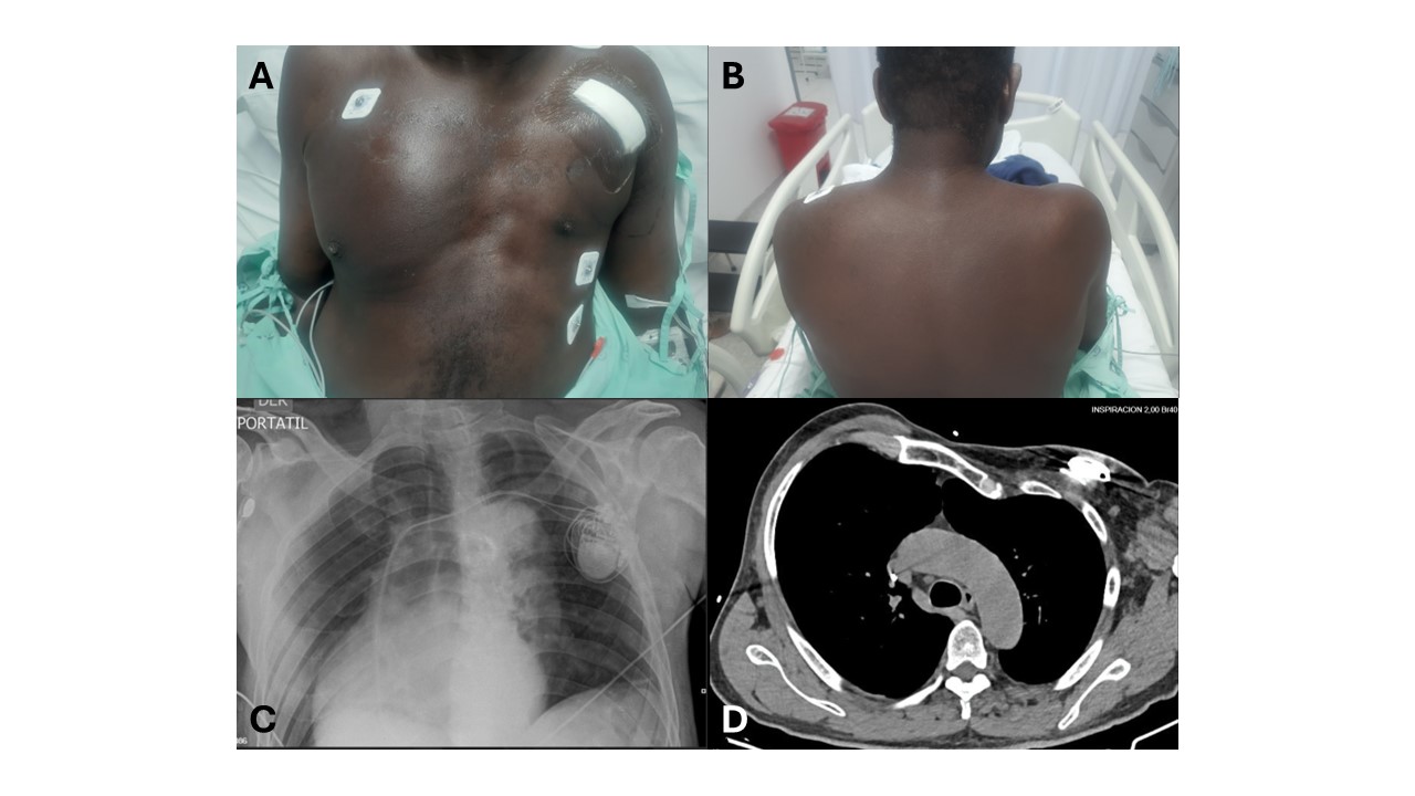 Paciente masculino de 68 años, afrodescendiente, originario del pacifico colombiano, con historia de hipertensión arterial sistémica, en manejo con Losartan 50 mg vía oral, cada 12 horas. Consulta al servicio de urgencias presencia de sincopes recurrentes de 1 mes de evolución. El examen físico del ingreso, en los signos vitales revela una tensión arterial de 146/81 mmHg, frecuencia respiratoria de 20 respiraciones por minuto y frecuencia cardiaca de 40 latidos por minuto. En la exploración por regiones revela una asimetría marcada de la caja torácica con aplanamiento, depresión del hemitórax izquierdo con ausencia del relieve del musculo pectoral mayor izquierdo y escapula alada. Figura 1A-B.
