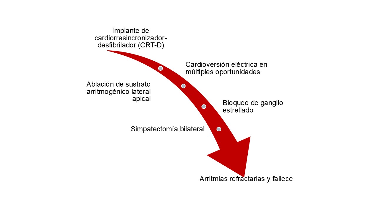 Figura 3. Intervenciones terapéuticas realizadas y evolución clínica hacia arritmias ventriculares refractarias con desenlace fatal. (Fuente propia)